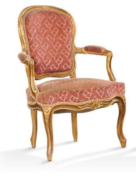 Paire de fauteuils à dossier cabriolet en bois sculpté et doré, à décor de fleurettes et feuillage.