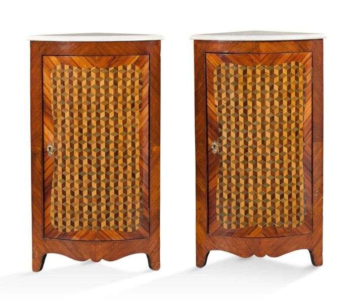 Paire d'encoignures en marqueterie de cubes sans fond, à façade arrondie.
