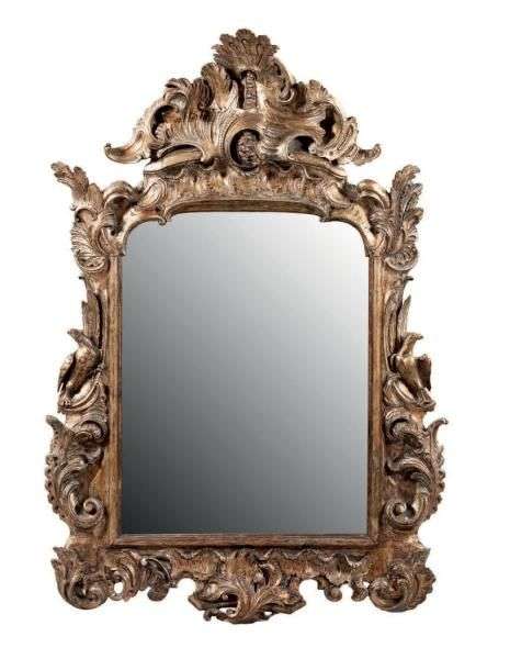 Miroir à fronton en bois sculpté et doré à larges feuilles d'acanthe, rinceaux feuillagés et entrelacs agrémenté de part et d'autre du miroir de deux oiseaux posés sur des branchages.