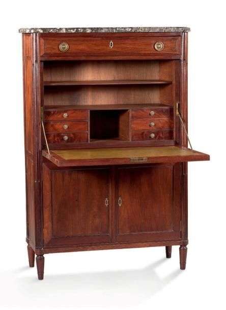 Secrétaire en acajou ouvrant par un tiroir, un abattant et deux portes en partie inférieure, les montants arrondis à cannelures.