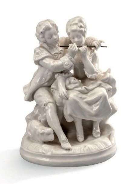 Petit groupe en porcelaine blanche représentant un couple galant, «La leçon de musique»