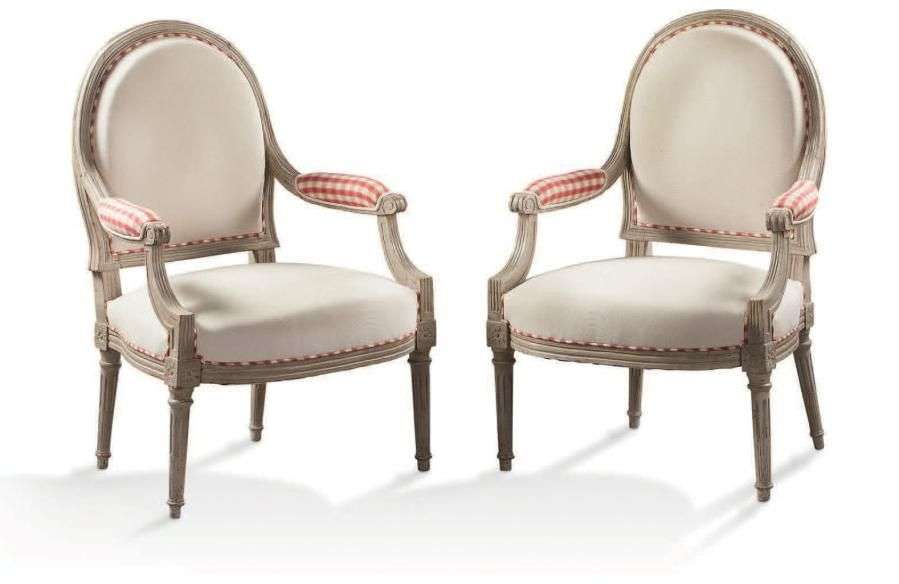 Paire de fauteuils laqué blanc à dossier plat, supports d'accotoir à enroulements, dés à rosaces, pieds fuselé à fines cannelures.