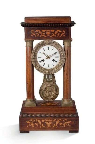 Pendule portique en placage de palissandre et marqueterie de bois clair| elle repose sur quatre colonne avec base et chapiteau en bronze ciselé et doré.