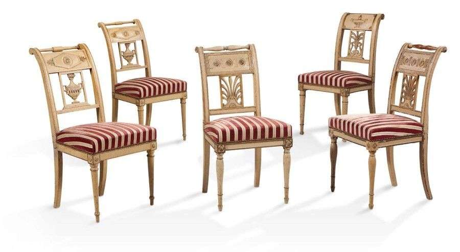 Ensemble de mobilier à dossier renversé comprenant deux paires de chaises, deux fauteuils et une chaise (différences) en bois laqué crème rechampi vert