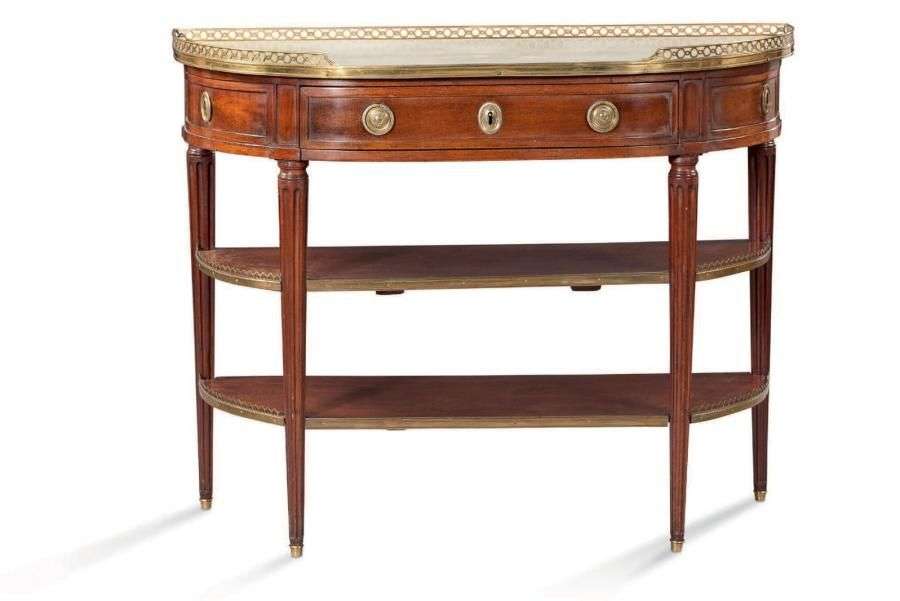 Belle console desserte demi-lune en acajou et placage d'acajou, ouvrant en ceinture à un tiroir central entouré de deux faux tiroirs.