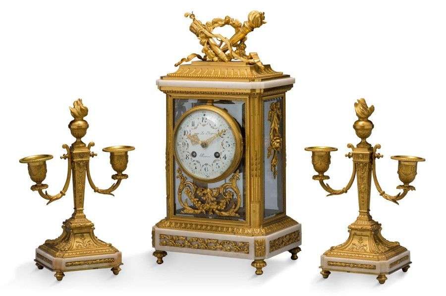 Garniture de cheminée en marbre blanc et bronze ciselé et doré.