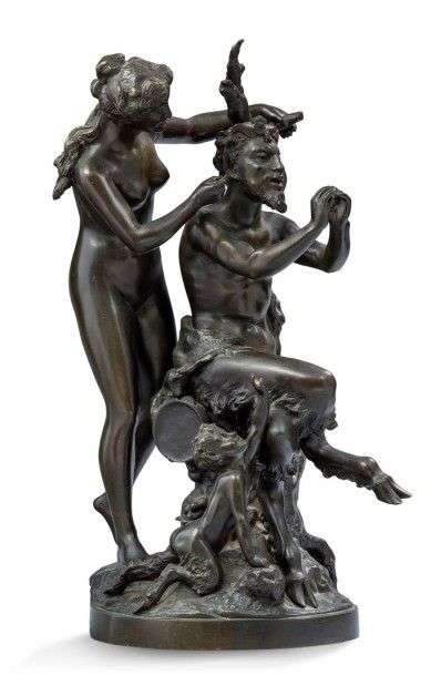 Groupe en bronze à patine brune représentant un faune et une bacchante
