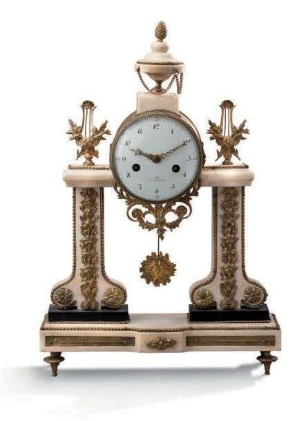 Pendule portique en marbre blanc et bronze doré reposant sur un socle rect