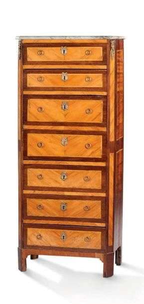 Secrétaire simulant un semainier de forme rectangulaire en placage de bois en bois de rose et encadrement d'amarante.