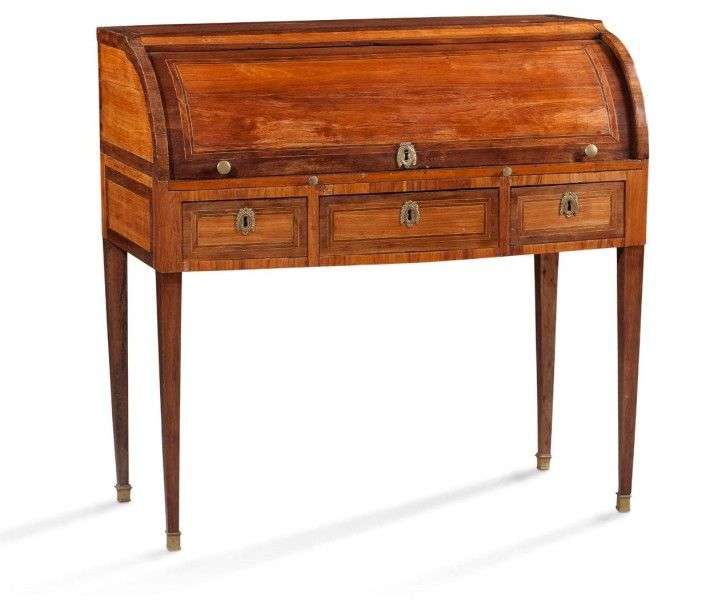 Il ouvre par un cylindre découvrant la surface d'écriture gainée d'un cuir, quatre tiroirs et un casier.