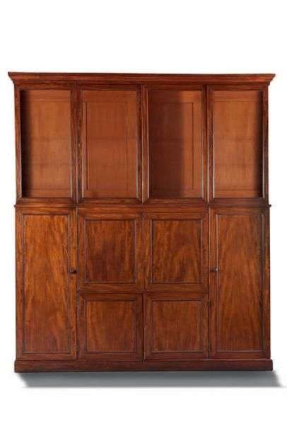Bibliothèque - Ecritoire deux-corps en acajou, ouvrant par quatre portes vitrées en partie haute, quatre portes pleines en partie basse, un grand abattant dissimulé forme écritoire en plein centre, laissant apparaitre une série de tiroirs et de casiers.