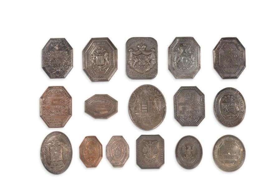 Ensemble de 16 plaques en métal repoussé dont plaques administratives (garde champêtre, poste, cantonnier, canal, police) et plaques de gardes de propriétés (Louvois, Chavagnac, Sancy, Gallifet...)