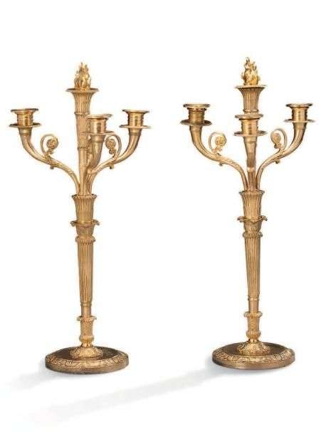 Paire de candélabres à quatre lumières en bronze doré ciselé de volutes à