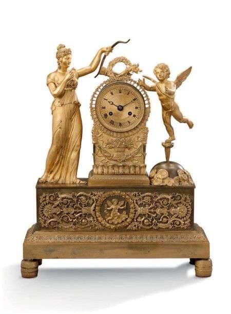 Pendule en bronze doré à deux patines sur le thème de Diane Chasseresse.