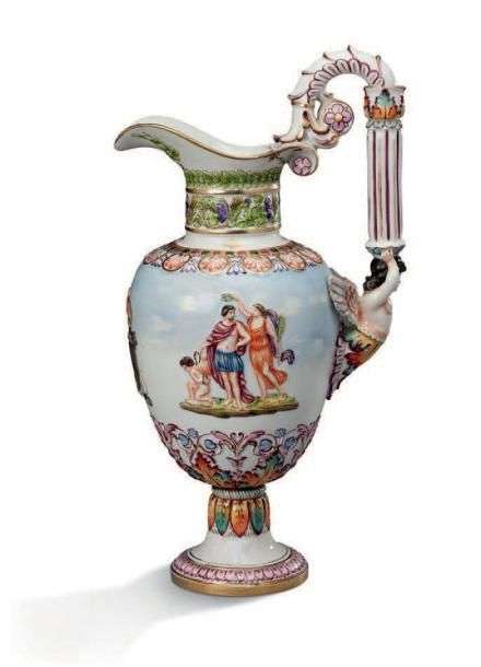 Aiguière en porcelaine polychrome présentant un décor en relief de scènes mythologiques.