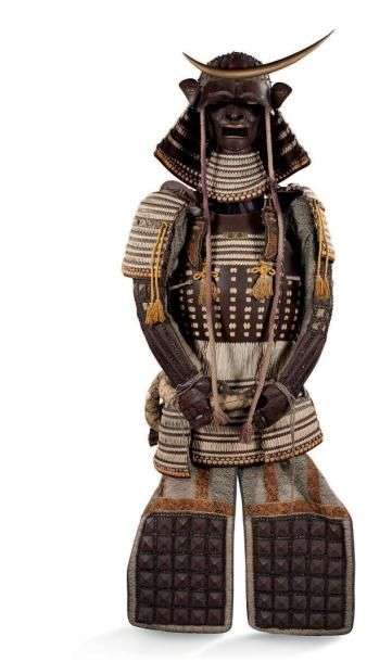 Armure de Samouraï composé d'un kabuto (casque), agrémenté d'un ornement frontal en croissant de lune, avec un Shiroko (protègenuque), un mengu en fer, protection de chaque côté d'un Sode, le Do (la cuirasse) comporte un hato a- no ita et un Sendan no-ita terminé par un Kusazuri (jupe), les kote (brassards) terminent la structure haute de l'armure.