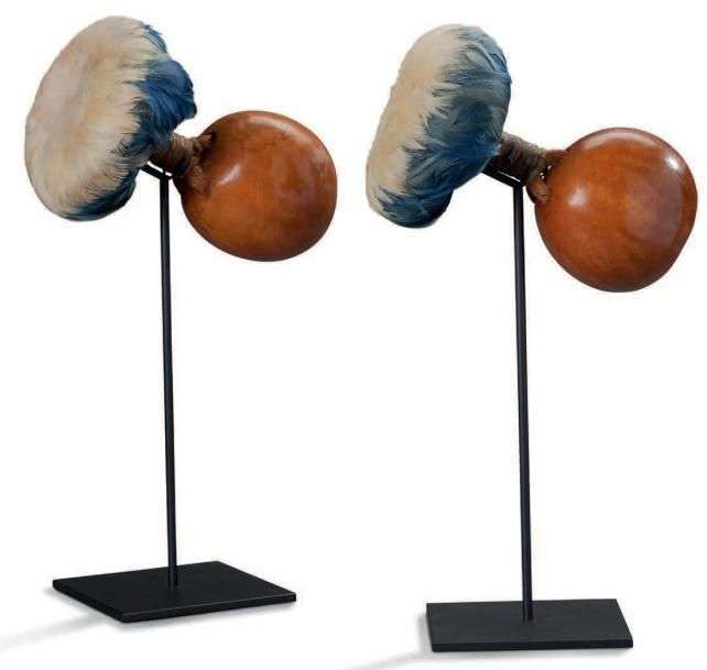 Paire d'uli uli. Le corps de cet instrument de percussion est constitué d'une noix de coco remplie d'élements comme des graines ou des graviers| la main se positionne sur la prise, directement sous l'ornement de plumes, sorte de plateforme, constitué de plumes teintes de gallinacés.