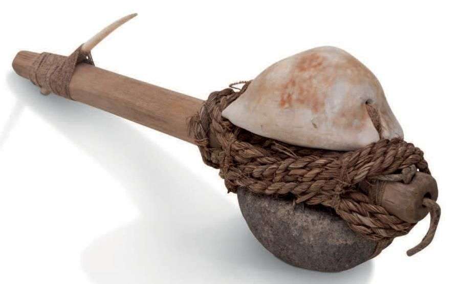 Un coquillage est ligaturé sur un axe d'hameçon en bois, lesté par une pierre travaillée, le dard ligaturé à l'extrémité