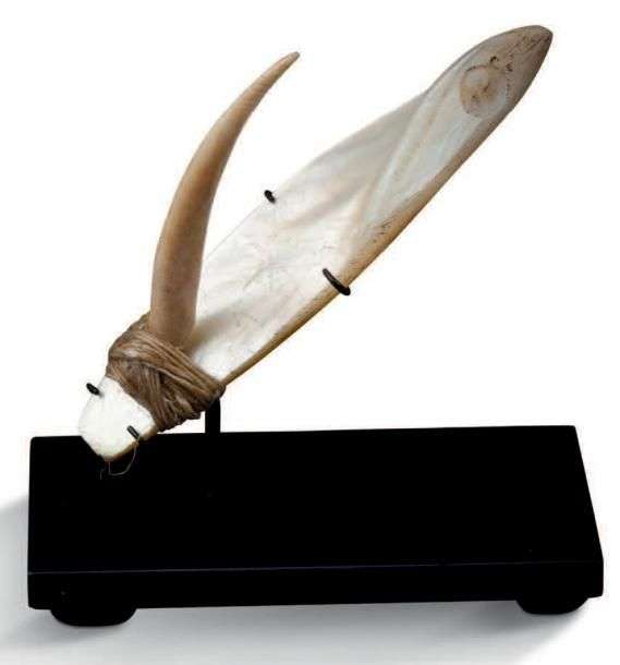Bel ardillon en os fixé sur une hampe en nacre. Un point de colle en consolidation sur les fibres