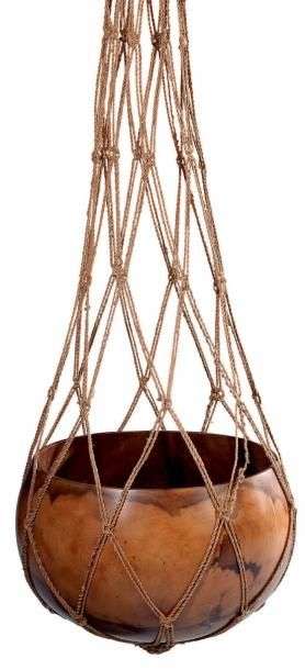 Beau bol hémisphérique montrant toute la préciosité des nuances du précieux bois de Kou. Superbe patine naturelle profonde, lustrée par le temps et l'usage. Il est accompagné de son filet de suspension destiné à le suspendre et à le transporter,au nouage complexe en fibres d'olona tressées