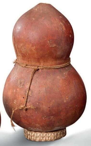 La gourde précieusement réalisée avec deux niveaux découpés dans deux coloquintes superposées. Patine montrant un grand usage.