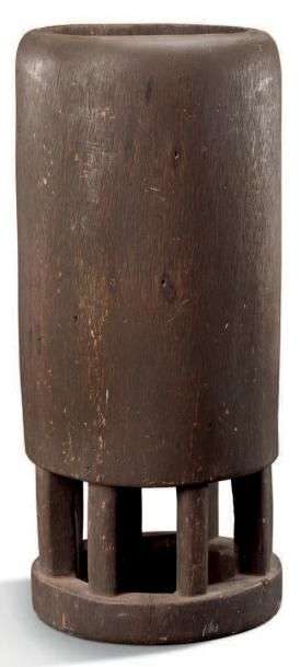 Tambour monoxyle à fût circulaire montrant en partie basse une courronne de pieds reposant sur un anneau de bois