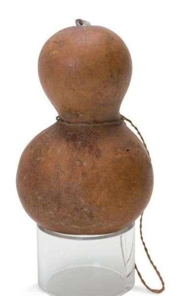 Gourde à eau à double corps superposé. Bouchon formé d'un coquillage et ficelle en fibre pour le portage.