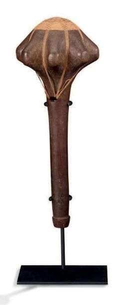 Tête de massue à protuberances circulaires, avec des fibres sur un axe en bois.