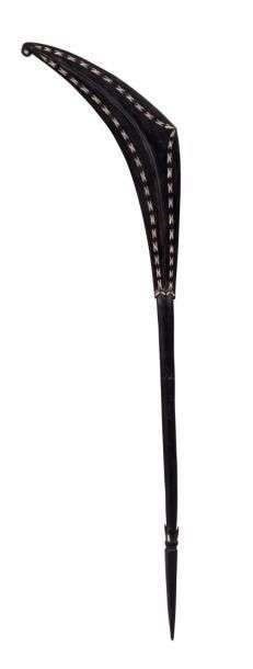 Massue utilisée comme bouclier dans des danses imitant des combats. Elégante massue au long manche cylindrique se terminant par une sorte de pale.