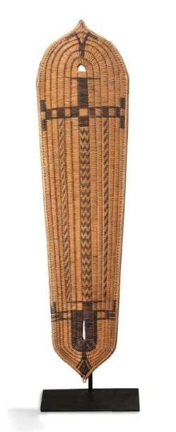 Beau bouclier oblongue en vannerie à décors géométriques. Petites usures.