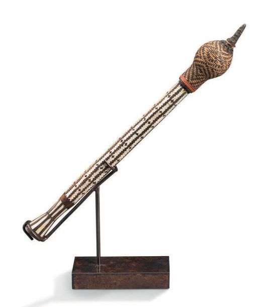 Bâton cérmoniel à belle ornementation de nacre. Protubérance au sommet formée d'une vannerie à décor de zigzag. Symbole de pouvoir et de vaillance lors des combats.