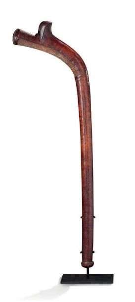 Sculptée dans un bois dur (Casuarina) à la superbe veinure, cette massue présente une tête courbe munie d'un appendice. Les massues gata étaient utilisées, dans les îles Fidji, comme armes de guerre et lors de rites religieux. Belle patine rougeâtre.