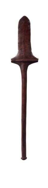 Massue pagaie Fidjienne. Le manche cylindrique est surmonté par la tête de forme foliacée, Une arête transversale en relief, à la base de la tête, vient renforcer la puissance de cette arme cérémonielle. Ce type de massue était réservé aux chefs et aux prêtres. Décor denticulé avec à la base un bouton en bois débordant. Belle patine pour cette élégante massue.