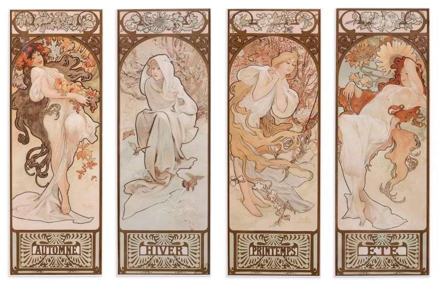 Suite de quatre lithographies polychromes à rehaut d'or représentant le printemps, l'été, l'automne et l'hiver.