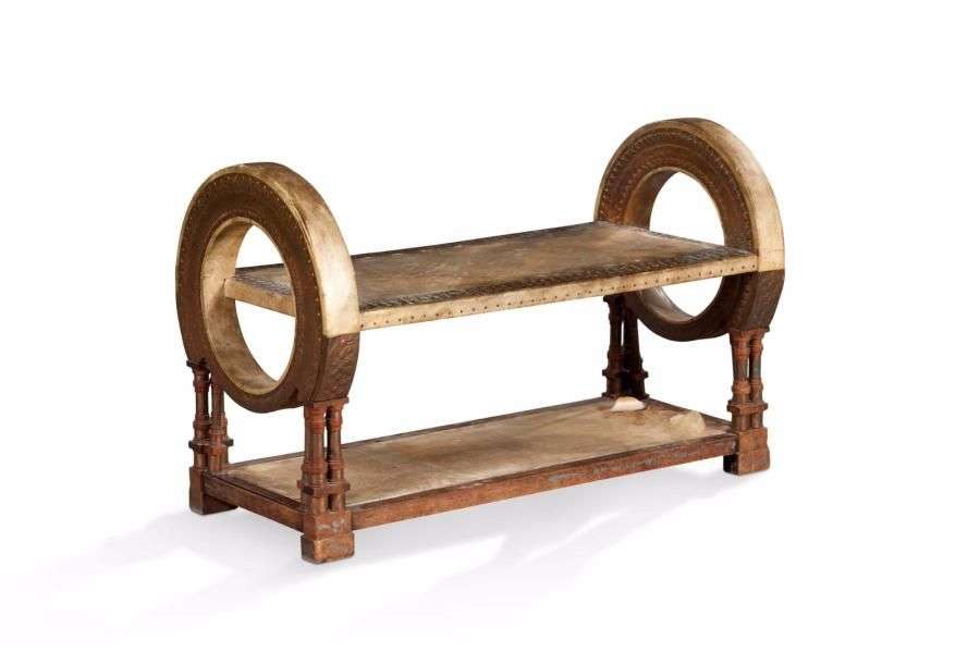 Banc en hêtre patriellement recouvert de parchemin, de plaques de cuivre repoussées et d'incrustations d'étain stylisés d'inspirations orientales.
