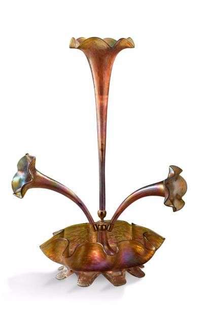 Important centre de table en verre marmoréen soufflé et moulé à chaud rouge nuancé jaune à reflet irisé à col mouvementé composé d'une monture centrale en laiton doré enserrant trois éléments coniques évasés formant corolle.