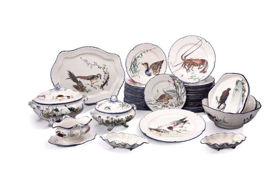 Partie de service modèle dit "Rousseau" en faïence émaillée blanche à bordures bleues à décor polychrome de volatiles, de crustacés et d'insectes comprenant trente et une grandes assiettes, ring trois petites assiettes, onze assiettes creuses, une soupière, un légumier, une saucière, une coupe sur piédouche, un saladier, quatre ramequins, trois plats circulaires et un rectangulaire soit environ 78 pièces.