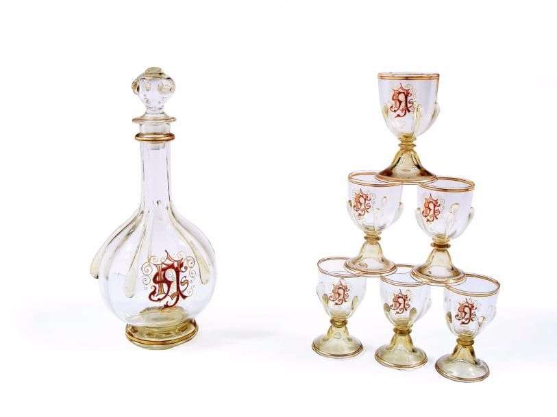 Service à liqueur en verre translucide et émaillé à rehaut de dorrure comprenant une carafe et six verres soulignés d'un monogramme et de goutelettes stylisées en application à chaud