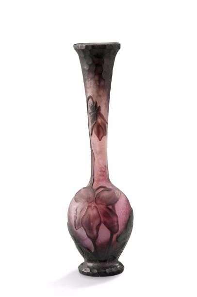 Rare vase miniature de forme balustre à décor dégagé à l'acide de motifs floraux bruns à nuances violine sur un fond opaque martelé.