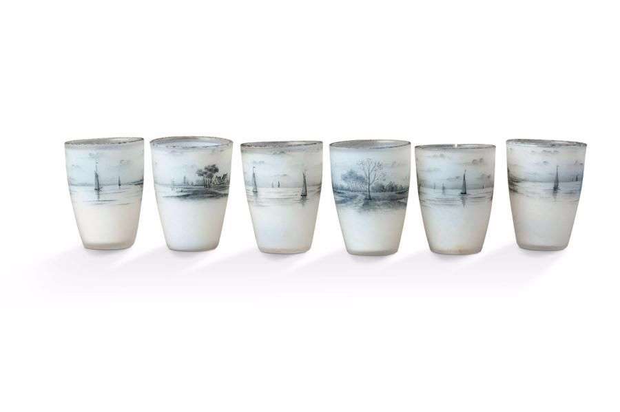 Suite de six petits gobelets en verre opalescent opaque à décor en grisaille d'un paysage lacustre et de bateaux voguant.