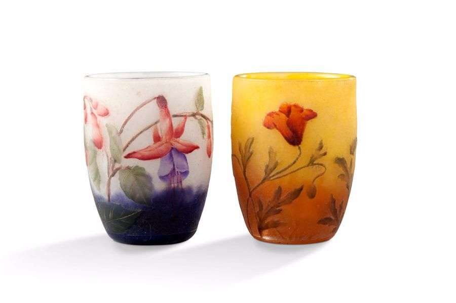 Suite de deux gobelets à corps ovoïde en verre doublé à décor dégagé à l'acide de motifs floraux émaillés sur fond blanc nuancé mauve pour l'un et sur fond orange nuancé pour l'autre.