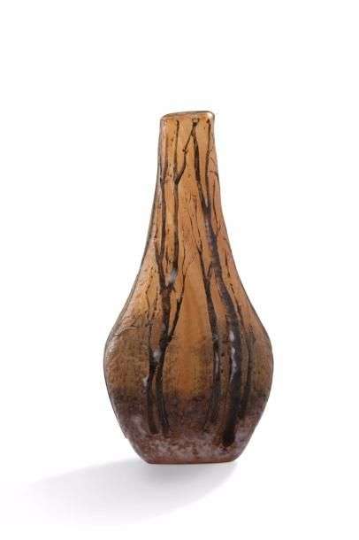 Vase miniature à base renflée et col droit en verre doublé à décor dégagé à l'acide et émaillé d'un paysage forestier enneigé brun sur fond opaque givré orange.