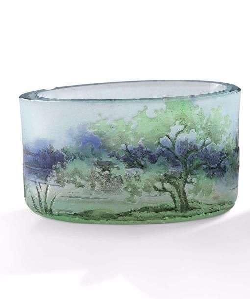 Coupe ovale miniature en verre doublé à décor dégagé à l'acide et émaillé d'un paysage lacustre arboré.