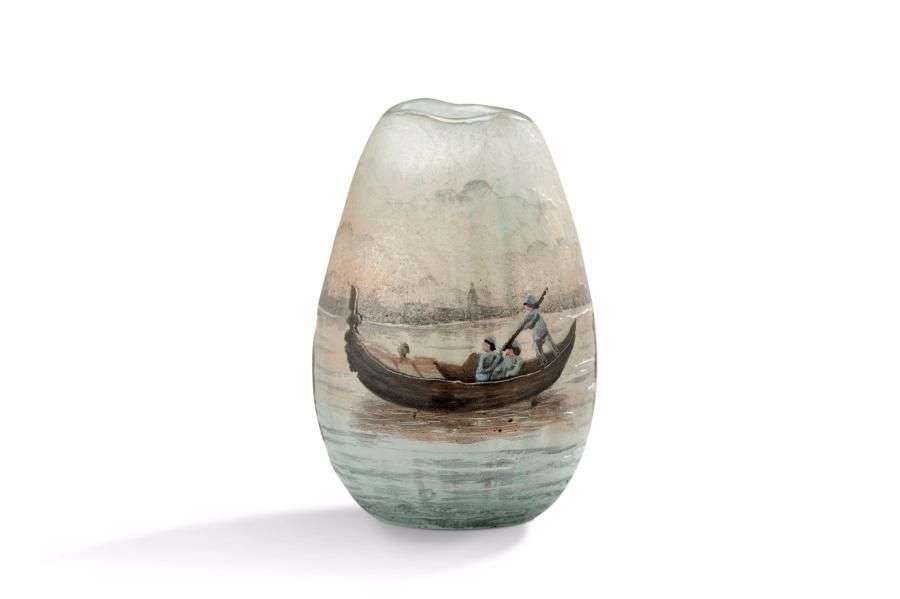 Vase miniature ovoïde en verre doublé à décor dégagé à l'acide et émaillée d'une gondole et de bateaux sur les eaux.