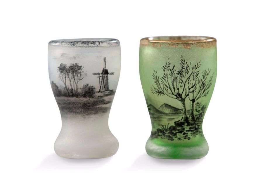 Suite de deux gobelets miniatures en verre opalescent et teinté verre à décor en grisaille d'un paysage au moulin pour l'un et d'un décor dégagé à l'acide d'un paysage lacustre valloné.