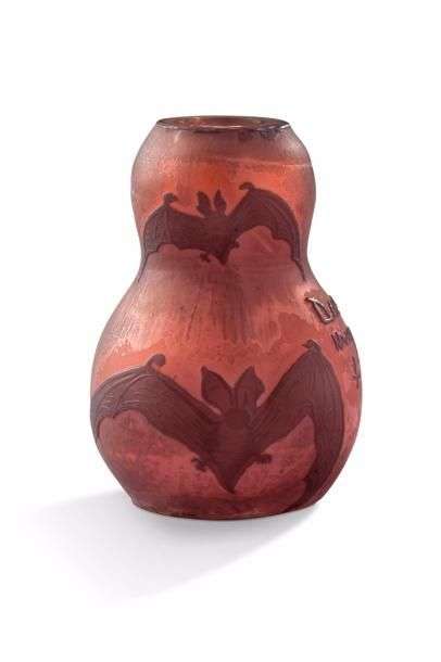Vase miniature à corps bilobé en verre doublé à décor dégagé à l'acide de chauves-souris en vol mauves sur un fond opaque rose.