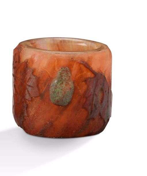 Vase miniature à corps tubulaire en verre doublé à décor dégagé à l'acide de feuilles de vigne brunes et d'un cabochon en verre teinté vert figurant un scarabée sur fond opaque orange nuancé.
