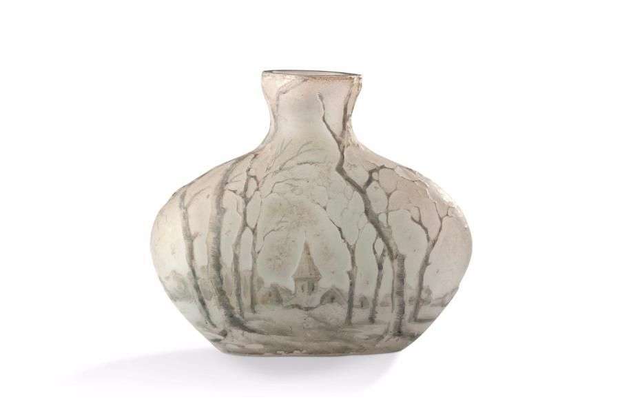 Vase miniature à corps ovoïde et col resserré en verre doublé à décor dégagé à l'acide et émaillé d'un paysage forestier enneigé et d'une vue de village.