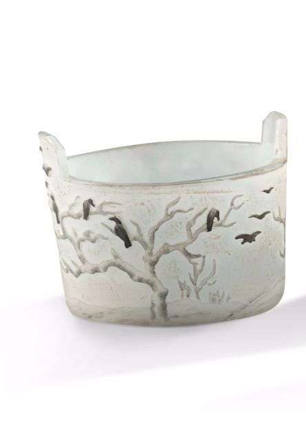 Coupe circulaire dite baquet en verre doublé à décor dégagé à l'acide et émaillé d'un paysage enneigé, d'oiseaux en vol et branchés sur un fond blanc opaque.
