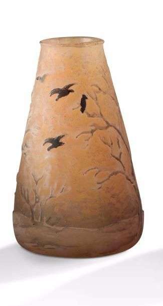Vase miniature à corps conique en verre doublé à décor à l'acide et émaillé d'un paysage enneigé, d'oiseaux en vol et branchés sur un fond jaune opaque.
